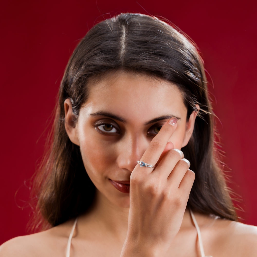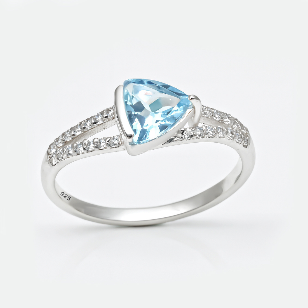 Add refined elegance to your jewelry collection with this Classic Silver Blue Stone Geometric Ring. Designed with a striking triangular light-blue stone at the center, this ring offers a perfect balance of modern design and timeless sophistication.