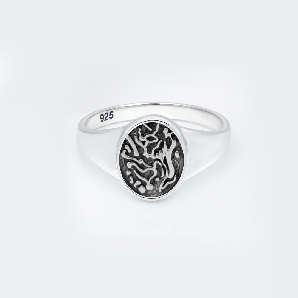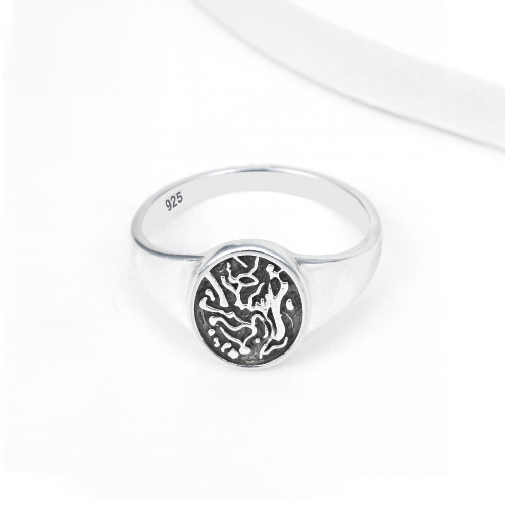 Crafted in 925 sterling silver, the ring features a smooth, polished band that enhances its premium appeal. The oxidized background highlights the intricate engraved design, creating a striking contrast that makes this piece stand out while maintaining a refined look.