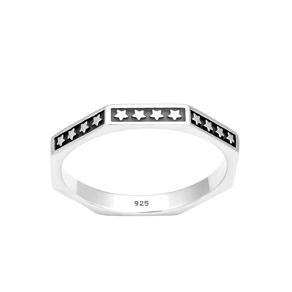 Crafted in 925 sterling silver, the band features a sleek geometric shape with detailed star cut accents that enhance its modern appeal. The black enamel-style backdrop creates a striking contrast against the polished silver finish, making it a versatile statement piece for both men and women.
