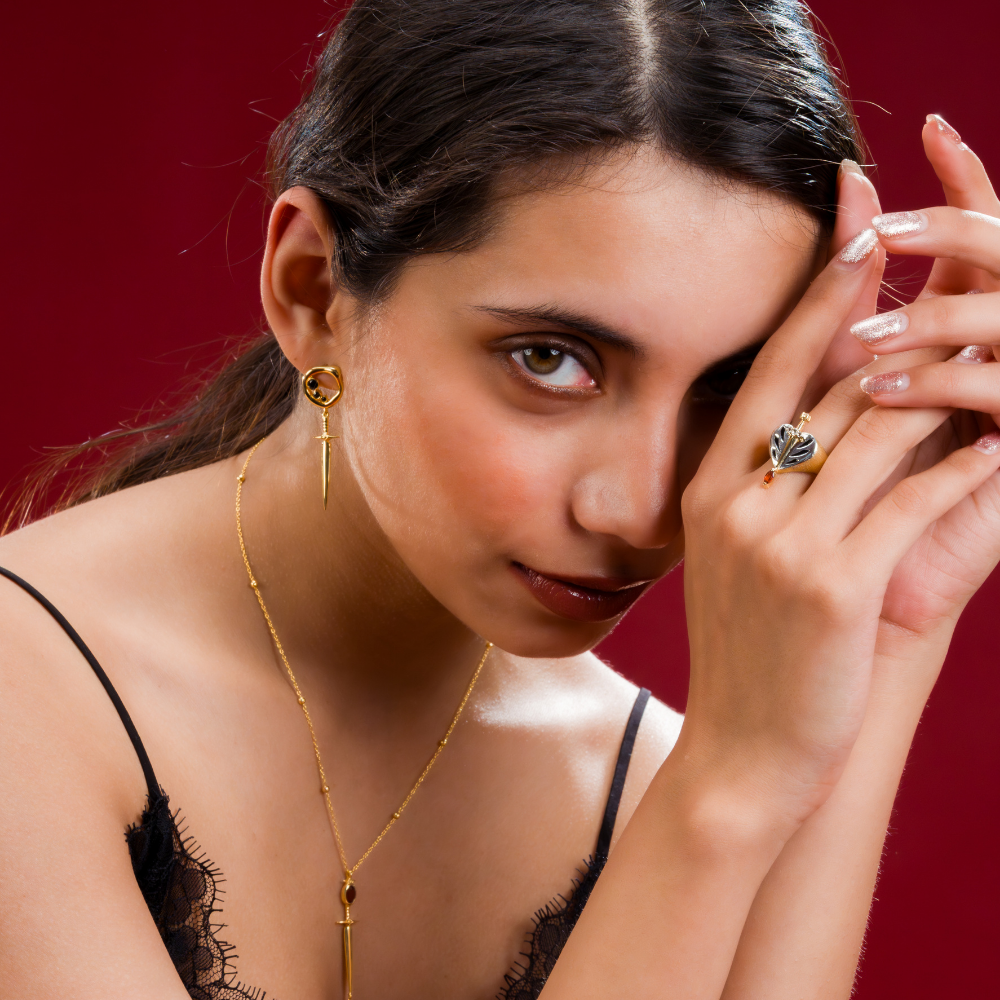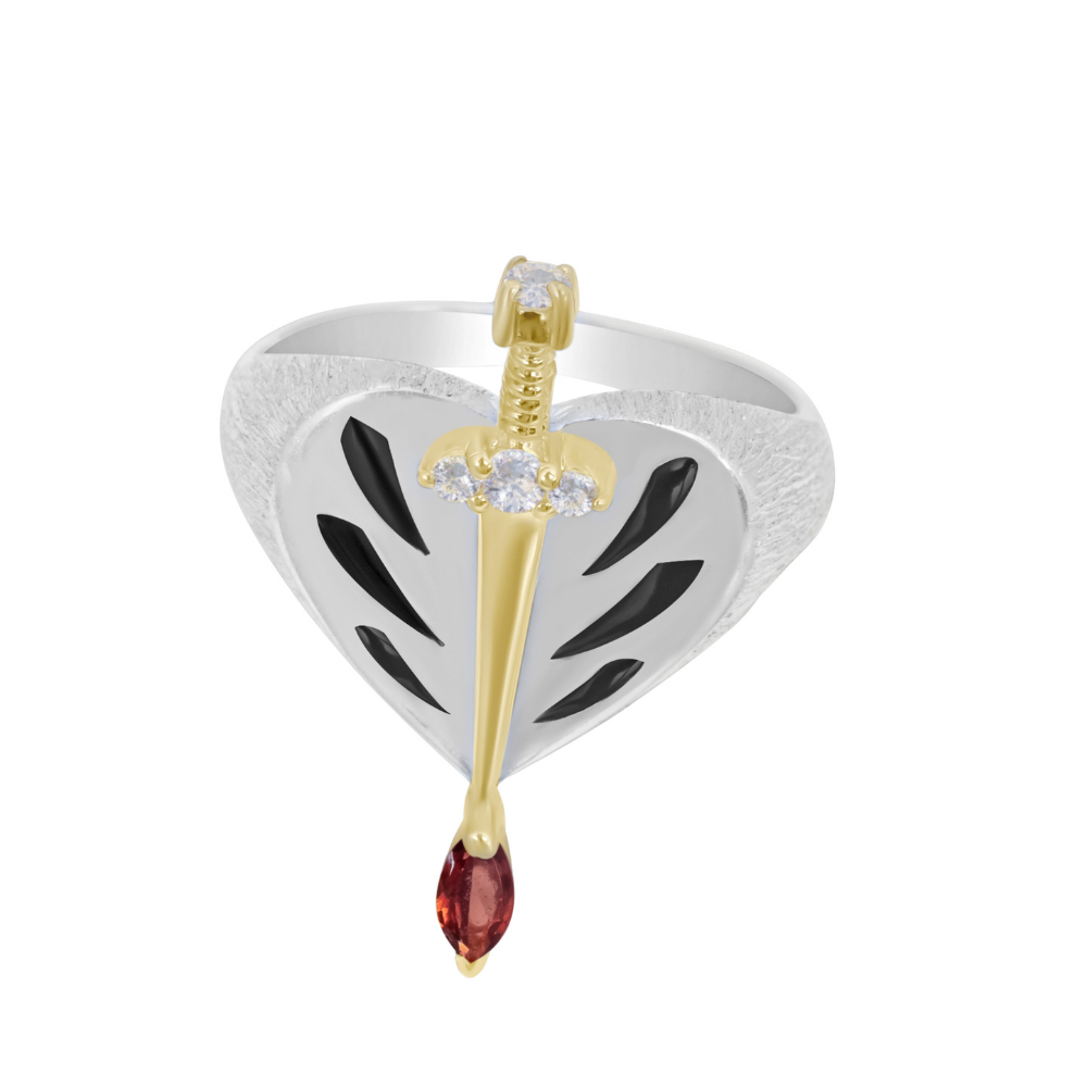 Add a bold and artistic touch to your jewelry collection with this Gold-Plated Heart & Sword Statement Ring. Designed with a striking heart-shaped centerpiece pierced by a sleek sword motif, this ring symbolizes strength, passion, and individuality.