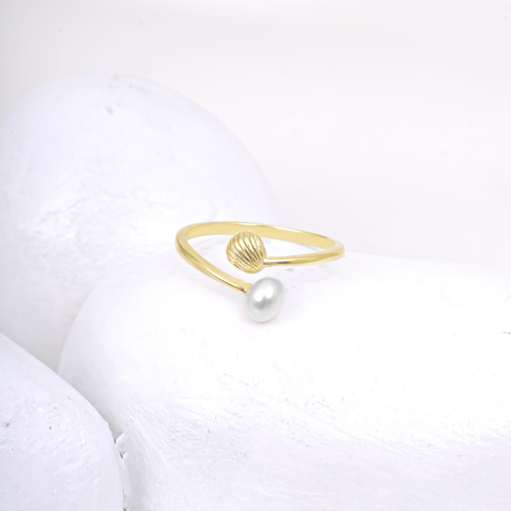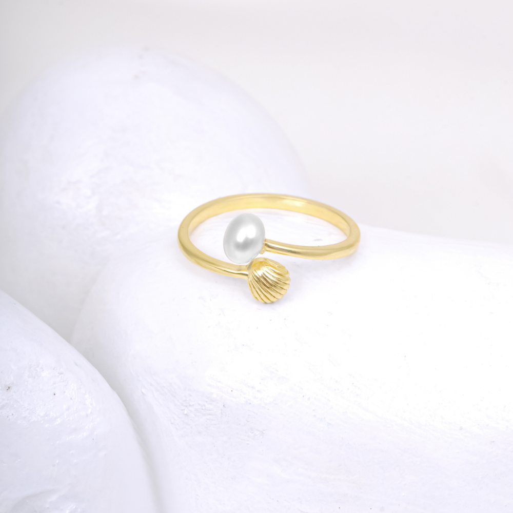 Bring a touch of coastal elegance to your jewelry collection with this Gold-Plated Pearl & Shell Open Ring. Designed with a delicate open-band style, this ring features a luminous pearl on one end and a beautifully detailed shell motif on the other.