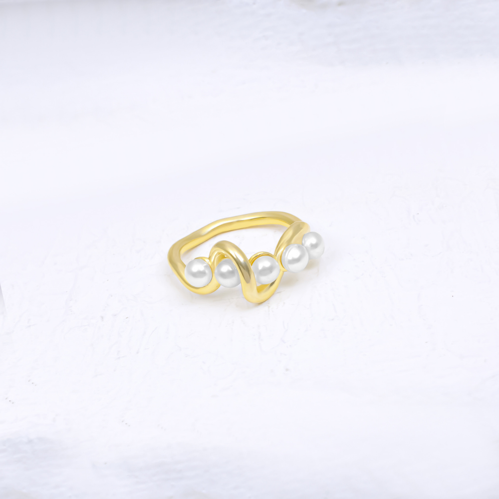 The smooth gold-plated finish enhances its modern yet timeless appeal, while the curved design adds a unique and stylish twist. The luminous pearl details provide a subtle contrast against the warm gold tone, making this ring both sophisticated and eye-catching.