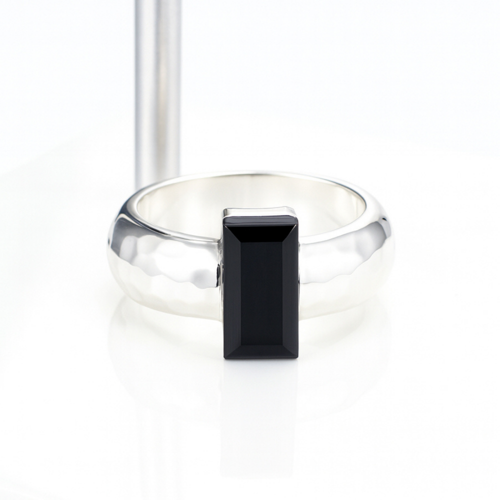 The ring showcases a smooth, polished silver-tone band with a slightly curved, comfortable fit. At the center sits a sharp-edged rectangular black stone, securely set to create a clean and structured look. The contrast between the glossy silver finish and the deep matte black stone adds a refined and stylish touch.