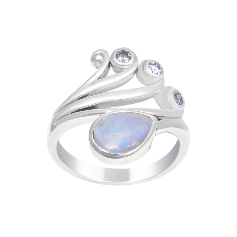 Graceful and luminous, this silver swirl statement ring captures the beauty of fluid design and soft iridescence. A pear-shaped, moonstone-inspired centerpiece reflects subtle flashes of blue and lavender hues, creating a dreamy glow with every movement.