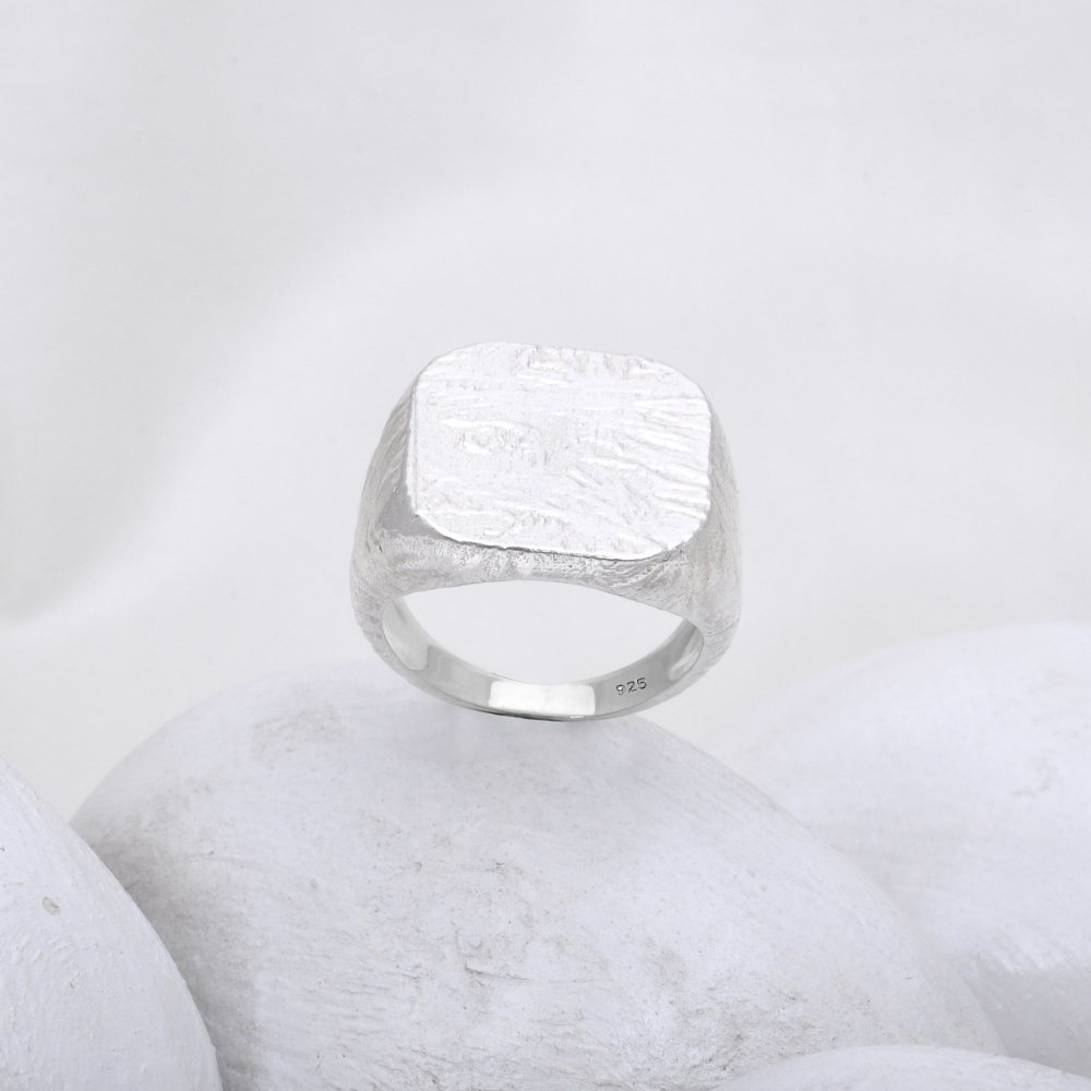 Make a bold statement with understated elegance. This textured matte silver signet ring features a solid square face with a raw, handcrafted finish that adds character and individuality.